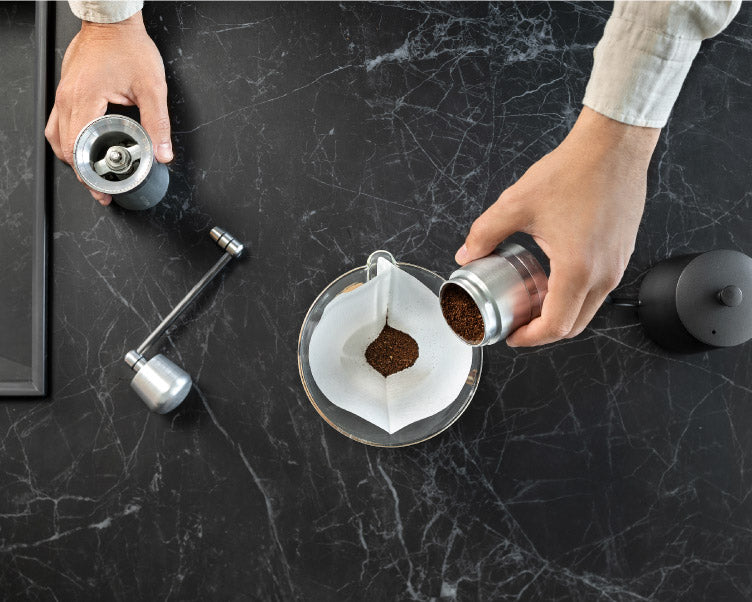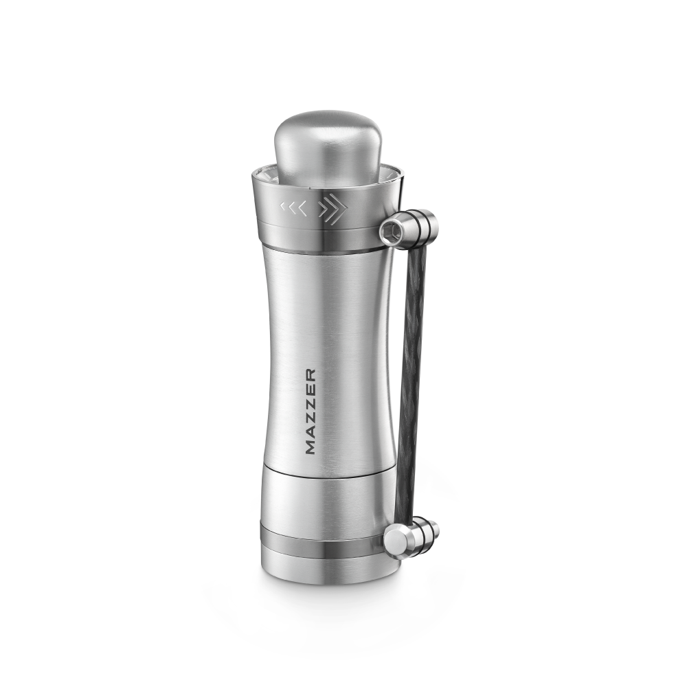 Omega features carbon fibre components for strength and lightness, neodymium magnets for clever use and storage, stainless steel and aluminum to optimize mechanical performance and tactile feeling. The ergonomic opening with a swift-release knob enables effortless loading of coffee beans.